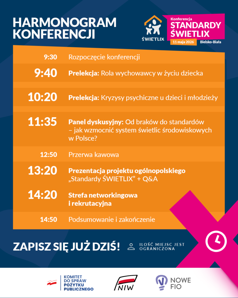 Już w poniedziałek 11 maja spotkajmy się w Bielsku-Białej na konferencji pt. „Standardy ŚWIETLIX”! W programie mamy dwie prelekcje tematyczne, panel dyskusyjny, a także przedstawienie założeń projektu, w ramach którego stworzymy ogólnopolskie standardy działania i dokumentacji w świetlicach środowiskowych. Nie może Was zabraknąć! Rejestracja na wydarzenie ruszyła dzisiaj.
